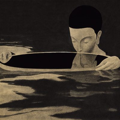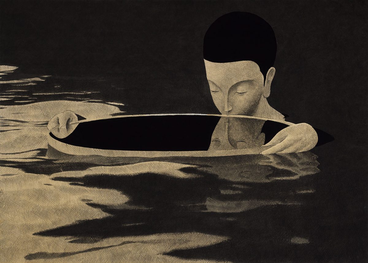 De sa formation en peinture traditionnelle orientale, Moonassi retient l’usage des matériaux – le papier, l’encre, l’eau – ainsi que l’essence spirituelle – représenter des sentiments plutôt qu’une ressemblance. Dans une esthétique très contemporaine, il déploie de grands aplats noirs desquels surgissent des personnages évoluant dans des paysages énigmatiques et silencieux. Les mises en scène, qui semblent parfois toucher à l’irréel, s’inspirent des souvenirs et de l’imaginaire poétique de l’artiste. Conçues comme des explorations métaphysiques de la condition humaine, les œuvres singulières de Moonassi offrent une palette infinie d’émotions et nous plongent dans un univers onirique aux interprétations multiples.